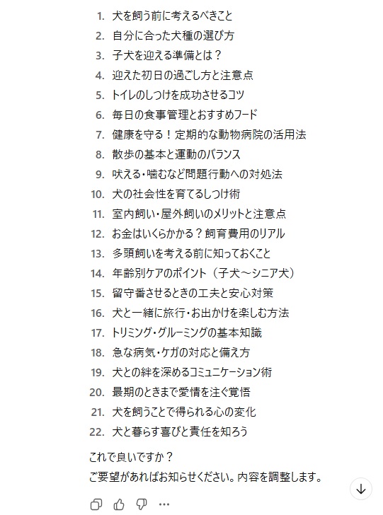 たとえば「犬の飼い方」についての本を作成したい場合、「犬の飼い方」とキーワードを入力すると、このような章ごとの目次を提案してくれます。